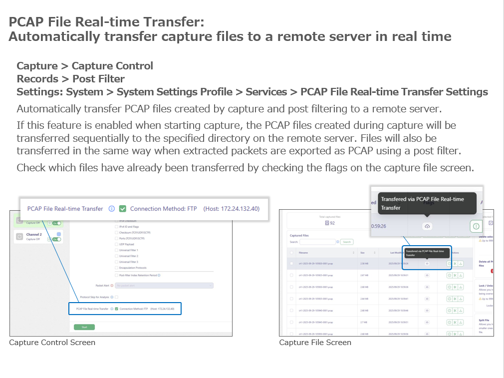 New features and improvements have been added, including real-time PCAP file transfer to an external remote server with flow control,