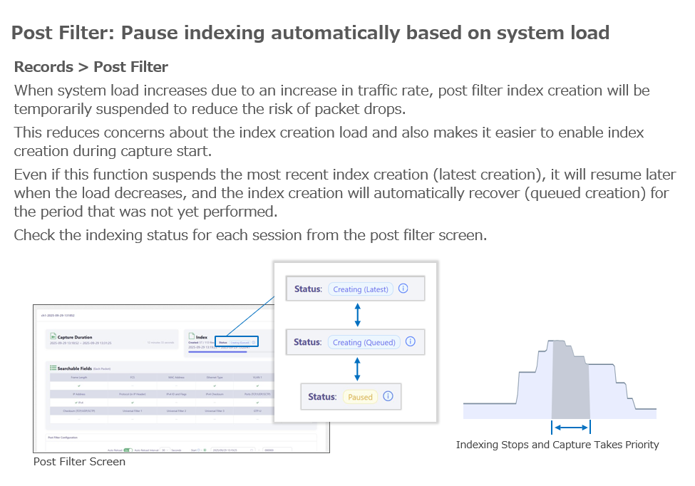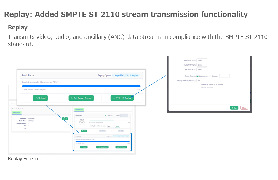 dynamic creation of post-filter indexes according to system load, a generator functionality, and a replay function that supports ST2110 replay.